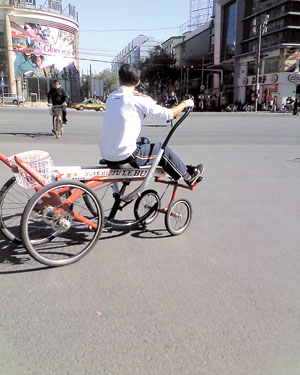 “自行车用手划,实在太有意思了!”10月15日,热心市民李先生致电《北京晨报》,表示在北京市崇文门附近的大街上看到一辆造型奇特的健身自行车——车的驱动靠双手,而非脚蹬。“骑车就像划船一样!”而且车速飞快,李先生笑称,自己骑的是电动自行车,“愣是没追上这位划车人。”记者看到,比起一般自行车,这辆手划自行车显得车身超长,大约1.5米。红、白、黑三色相间,前面是两个小轮,后面是两个大轮,车后座上还固定有一个小巧的车篮。一般自行车的横梁变成了“滑道”,座位就架在两条“滑道”上。脚踏板成了搁脚的地方,且由于设置得比较高,使人坐上去的姿势也很像划艇运动员。最引人注目的则是车上两只类似船桨的手柄,大约1.5米长。只见划车人像划船桨一样,双手握住手柄一张一合,好像做扩胸运动,从而牵动车链,促车前行。每划一次,车就向前行驶一段,且速度很快,累得划车人汗流浃背,看上去健身效果极佳。不仅如此,划车上街还很是抢眼,引来不少路人侧目惊叹。