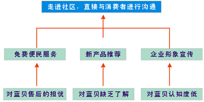 此次活动以完美的售后服务为切入点,带动产品销售,提高知名度。消费者不了解蓝贝,我们就主动走到他们面前,去跟他们打招呼,去跟他们做自我介绍,让他们认识我们,了解我们的产品,让客户了解蓝贝产品的同时,对以后的销售起到一个推波助澜的作用。