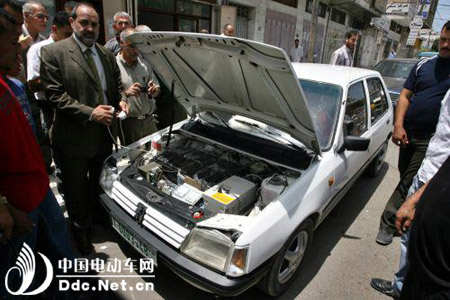 5月21日,在燃料紧缺的加沙地带,人们围观一辆由法耶兹·安曼(前左)等当地电气工程师共同设计的电动车。这辆车充电一次可以行驶200公里。