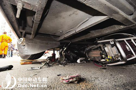 “当时电动车是从中巴车左前轮的位置钻入大巴车底下的。”目击者林先生说。