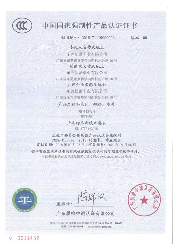 2018-09-10 喜报!新蕾荣获行业首批电动自行车CCC认证证书