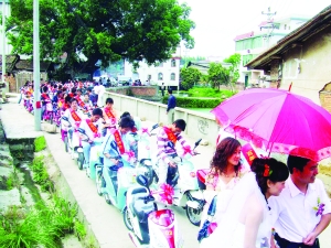 一辆崭新的红色电动车——车篮里放着一大把红艳欲滴的玫瑰花——载着新郎和身穿白色婚纱撑着红伞的新娘。在新郎新娘的电动车后面,四十七辆电动车分成两列,紧紧跟着,非常显眼。电动车上是47个年轻人,每个人身上还披着一条印有“百年好合”字样的绶带。48辆电动车,喜气洋洋,浩浩荡荡,从市尾村塔后社到南坑街道办事处凤梧村,途经市区热闹的南昌路,一路“招摇”。这一娶亲场景引得许多路人驻足观看,有几个年轻人还在路上用力挥手,大喊“好浪漫啊”。