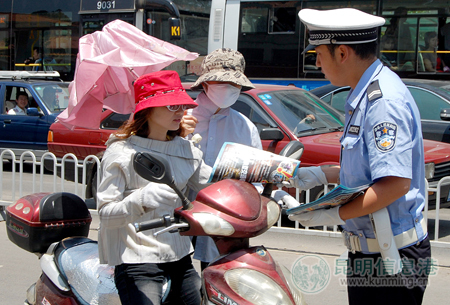 10日,昆明市交警支队各个岗位都派有交警向骑电动车的人发放宣传单,让大家明确,今天起,将对电动车载人、不按规定车道行驶、逆行、闯红灯进行处罚,处罚金额为50元以下。此前,有市民致电都市时报热线:“电动车能否带儿童?”对此,市交警支队表示:“电动车比照非机动车管理,按照《省道路交通安全条例》第51条,允许电动车带一个1.2米以下的小孩,应当设有安全防护座椅。” 昨天,刘女士打进都市时报电话问:“我儿子快10岁,读三年级,每天都是我骑电动车带他上学、放学。他身高约1.4米,对电动车载人进行严管后,我还可不可以用电动车带他?” 对此,市交警支队法制处表示:电动车归入非机动车类,电动车的管理比照自行车的管理进行。《交通法》里关于自行车载人有指导性意见,但没有具体规定。《市道路交通安全条例》51条第三款规定:自行车、电动车只能载儿童,并备有安全座椅;《省道路交通安全条例》第51条第十款规定:自行车不得附载身高超过1.2米的人员,自行车载人应当设有安全防护座椅。“因此,电动车不能载1.2米以上人员。”
