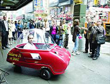 近日,世界最小的量产小车PeelP50电动车在纽约时代广场附近的人行道上展示,这种由电池供电的两座电动小车也许能够解决纽约交通拥挤和停车困难的问题。