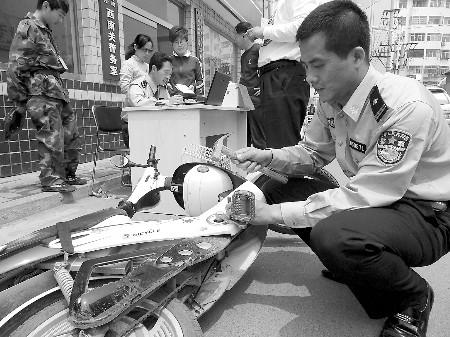 17日,在潍坊市潍城区公安分局南关派出所内,民警们正将该分局统一编排的编号以钢印的形式敲在居民的电动车车身上,然后将车主信息和电动车照片录入计算机,如此一来,电动车就有了自己的“身份证”。据了解,自5月13日开始,潍城公安分局开始对辖区内的电动车实行实名登记备案,目前每天前来“办证”的车主络绎不绝。