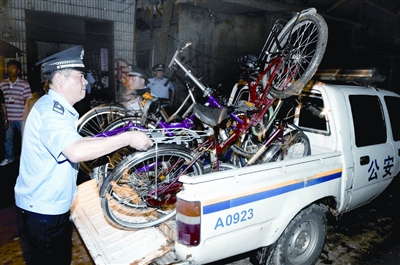 6月1日,长沙市东屯渡派出所夜间捣毁拆迁屋内的违法倒卖单车、摩托车等窝点,办案民警将藏匿在屋内的车辆拖出并装车。