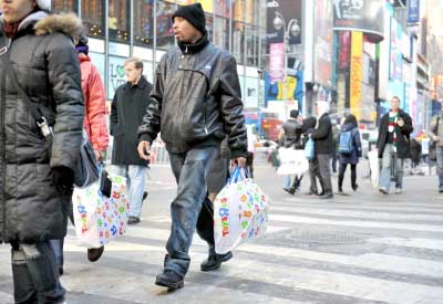 2009年12月24日,人们拿着购买的节日礼品走在美国纽约街头。新华社记者 谷欣容 摄