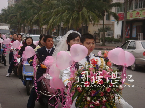 碧海银沙网讯(图文/刘锴栋 编辑/小 飞 云 海)今天上午11时许,霞山观海长廊出现了这样的一幕,一位穿着军装的部队军医一脸喜气,骑着电动车,胸前别着“新郎”字样,载着新娘子,后面还跟着10余辆电动车保驾护航。