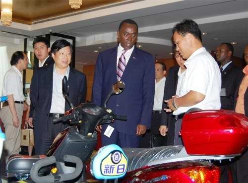 卢旺达总理尔纳.马库扎(中)在无锡市副市长方伟(左)的陪同下咨询新日电动车的特点