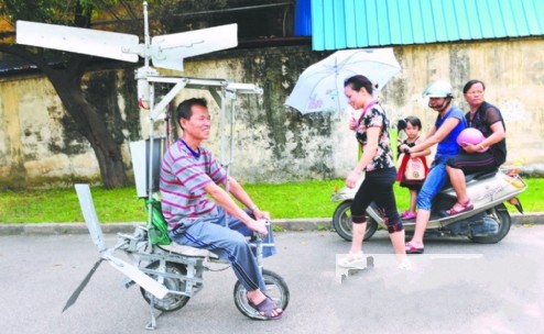 新发明一登场,即引来不少群众围观,大家好奇的观赏着这辆据称既可飞又可游的自行车。记者看到,所谓的“海陆空自行车”,其实就是一辆小电动车改装后在车身焊接了一个框架,外加三个螺旋桨而成。其中一只螺旋桨在头顶上,由数片电风扇叶组成,连接上一个马达。据介绍,这只螺旋桨主要担当飞翔的重任。