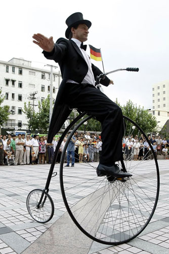 自行车随处可见,但我们见识到奇特的高轮自行车的机会就少了,德国高轮自行车团让人们见识了古老却稀奇的玩意。