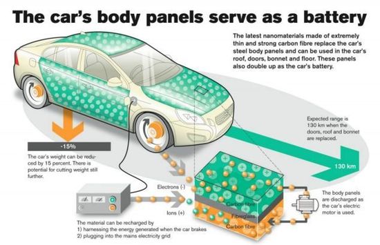 目前科学家们正在研究如何让这种复合材料储存更多的能量,和使用何种方式进行工业化规模生产,至于电池的安装则要在万事具备的最后阶段。届时,汽车的备用轮胎槽也将开创性地被改造成复合电池的储存室。如果沃尔沃公司的这个项目获得成功,那将有可能开辟出非常广阔的应用领域。譬如,移动电话的电池可以做得如信用卡一样薄,笔记本电脑充电一次可以工作更长的时间。