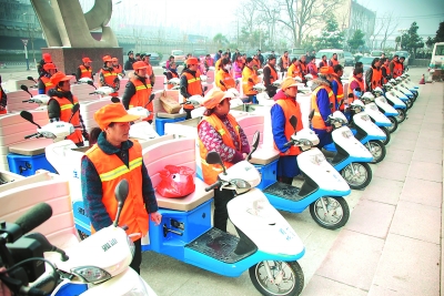 1月22日上午,合肥市蜀山区的环卫工人领着崭新的电动保洁车整装待发。当日,该区举行了“农村环境综合整治”电动保洁车配发仪式。