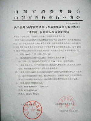 根据当前山东电动自行车市场消费需求情况,为了切实维护广大消费者的合法权益,进一步促进电动车行业健康稳步发展,山东省消费者协会和山东省自行车行业协会联合起草了《山东省电动自行车消费争议纠纷解决办法》,定于