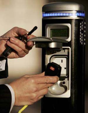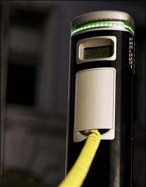 2006年12月6日,英国伦敦,一辆电动汽车正在免费电动车充电站充电。当日,英国伦敦西敏寺会大街上推出唯一免费电动车充电站。