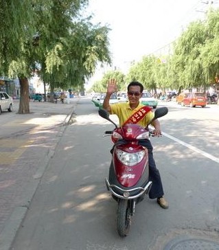 8月29日上午,杜洪峰老人骑着载有他发明的“车载充电装置”的电动自行车,向天津进发,向电动自行车厂家宣传他的发明。