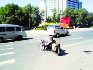5日10时许,在长春南湖广场上,一辆独特的自行车吸引了众人的眼球。这辆自行车有三个车轮,可以躺着骑,除了正常自行车配备的零件外,还装有变速装置、后视镜、照明灯和电子表。