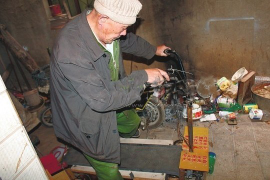 对于大多数70多岁的老人来说,在家里享享清福也就可以了,可住在昆明市龙头街东坪村的李林森老人却没闲着。79岁高龄的他凭着一手木工手艺搞起了小发明,用家里的废旧电动车,给曾孙女造了一台跑步机。