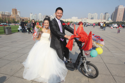 据了解,新郎叫王金钢,今年30岁,老家在牡丹江郊区农村,现在在三八广场附近一家饭店当厨师。新娘叫袁玲也是牡丹江人,在青泥洼桥一家商场当服务员。两个人的月收入总计有7000元,虽不富裕,但结婚这天租个车拉新娘子的钱还是有的。但是他们觉得没那个必要,正好新郎才买了辆电动自行车,俩人一商量,干脆决定结婚那天就用它当婚车吧。