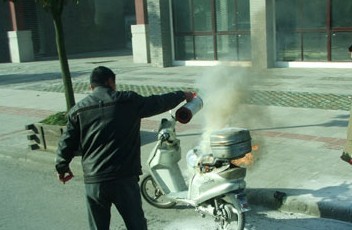 电动车骑着骑着,屁股底下却无缘无故的冒起了烟?淡定。停在路基旁烧着整棵绿化树却不救火?淡定。车子都快烧剩架子了,拿起打包的早餐继续吃?淡定!如此“淡定哥”更在消防员到后不打一声招呼悄悄离去,令人摸不着头脑。