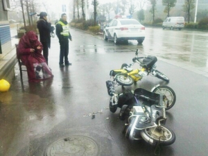上午8时多,卜先生称,听到“砰”的一声,他抬头一看,两辆电动车撞在了一起。“一个逆向行驶,一个从快车道快速转进来,没想到撞上了。”卜先生说,两电动车撞得碎片满地,倒在地上的是两名女子,其中一个牙被摔掉两颗,一个额头被撞破。