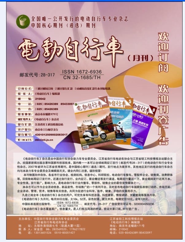 《电动自行车》杂志是由中国自行车协会助力车专业委员会、江苏省自行车电动车协会与江苏省轻工科技情报总站联合主办,经国家新闻出版总署和国家科技部批准、国内唯一一本可以全球邮局征订发行(邮发代号28-317)的电动车行业专业性杂志。2007年被评为江苏省优秀期刊,是中国核心期刊(遴选)。