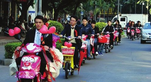 如今,许多年轻人用电动自行车作为“婚车”,既时尚又环保。