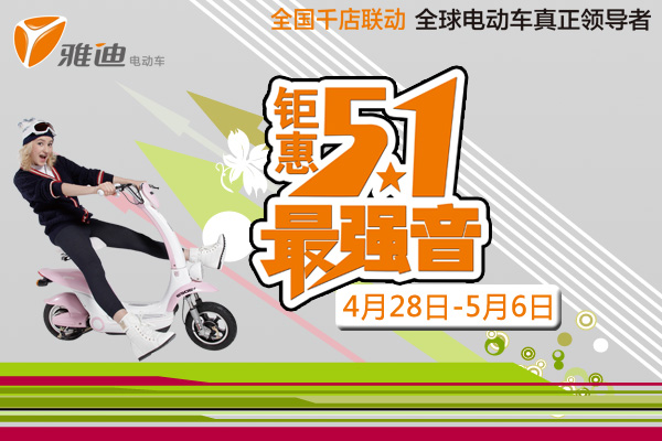 五一到了,各大商家纷纷推出打折优惠活动,希望能够吸引到更多的消费者。4月28日到5月6日,全球电动车真正领导者雅迪电动车联动全国千家店面,以新款产品,实惠的价格,联合大众媒体、公益组织结构,情系雅安献爱心,开展大型爱心义卖活动与各种劲爆推广活动,奏响了五一钜惠最强音。