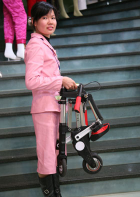 据介绍,这款自行车最大的特点是不骑时可以轻松折叠起来,拎在手里或者放入包内携带都不会觉得碍事,因此可以随时带在身边。(记者刘龙胜)
