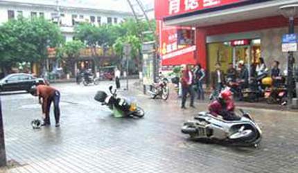 由于街面满是油污又碰上雨天,海口府城忠介步行街昨天上午上演了一起起摩托车、电动车摔倒的“惨剧”。记者在现场的半小时之内,先后有40多辆车摔倒,街面一时成了“溜冰场”,所幸没有造成人员受伤。在事故现场,记者致电向有关部门反映时,竟然没有一个部门前来过问此事。
