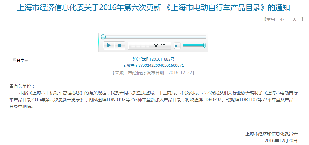 2016-12-28 上海经信委关于2016年第六次更新电动自行车产品目录